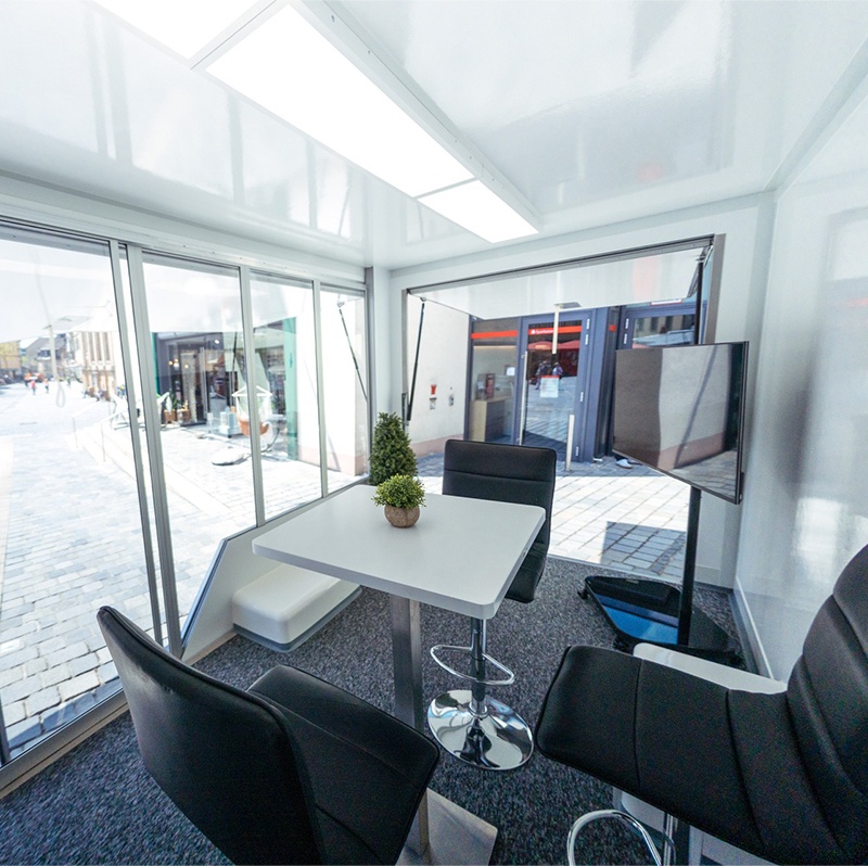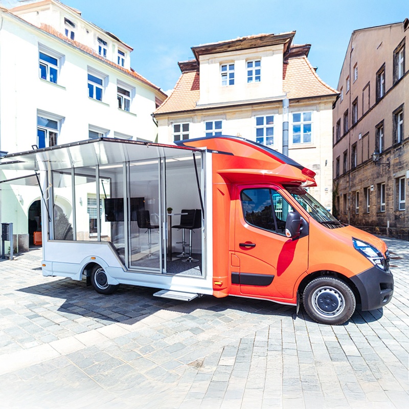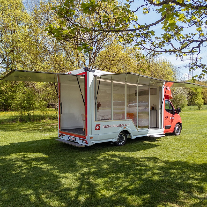 The best roadshow is exactly where it needs to be. With our City Tourer, that can be anywhere, anytime. This unit can be set up by just one person in under five minutes and can be driven with a standard driver's license. The simple design of the vehicle gives our customers a wide range of options for expansion: from use as a mobile office, showroom, or medical treatment room—anything is possible.