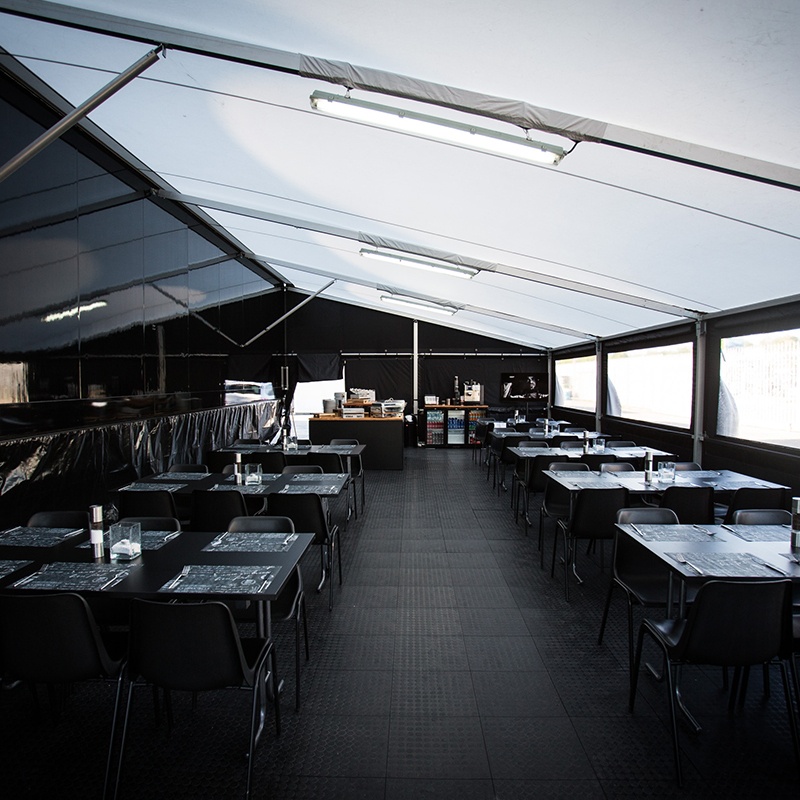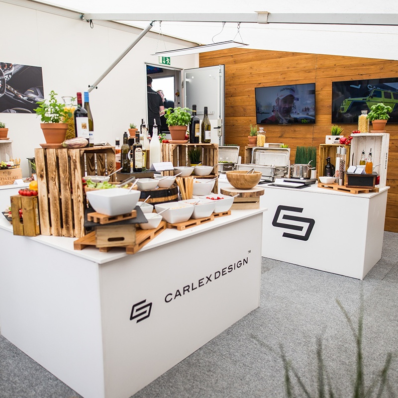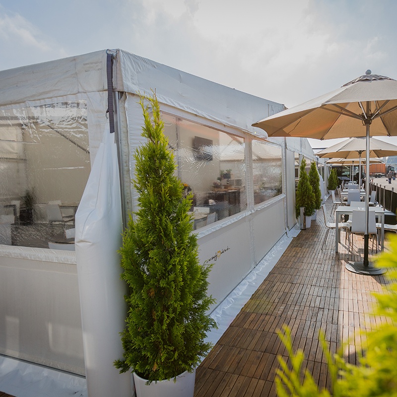 The Easy Tourer enables a professional appearance while offering outstanding cost efficiency. Thanks to its modular system, the size, branding, and interior design can be flexibly adapted—from 42 to 75 m², including a fully equipped catering kitchen. The unit can be set up in 4 hours and can accommodate up to 120 guests.